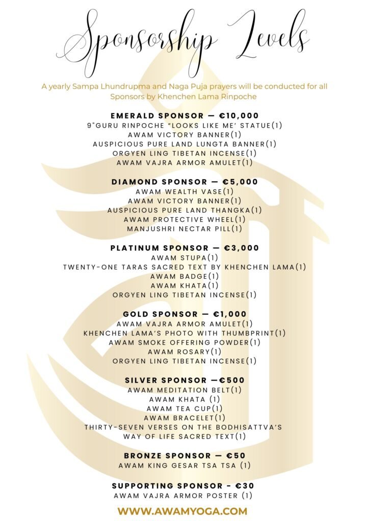 Each level of sponsorship (Emerald to Silver) is respectfully acknowledged with a set of five Dharma items. Bronze and Supporting Sponsors receive the Awam King Gesar Tsa Tsa and Awam Vajra Armor poster respectively. These offerings are not a transaction, but a gesture of gratitude for helping sustain the Dharma and this sanctuary.