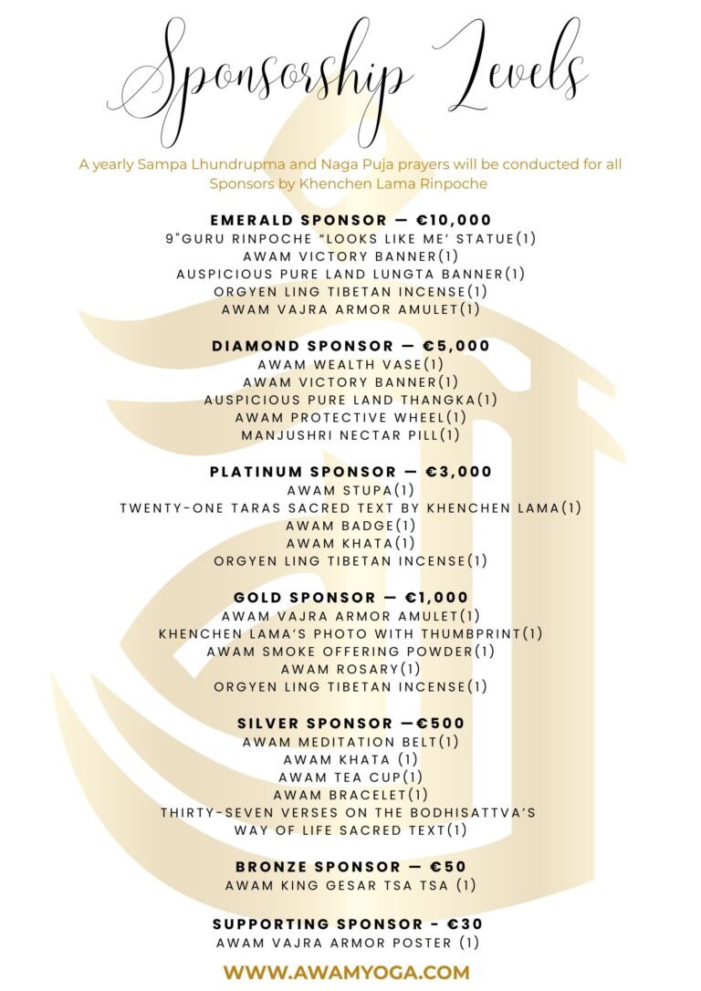 Each level of sponsorship (Emerald to Silver) is respectfully acknowledged with a set of five Dharma items. Bronze and Supporting Sponsors receive the Awam King Gesar Tsa Tsa and Awam Vajra Armor Poster respectively. These offerings are not a transaction, but a gesture of gratitude for helping sustain the Dharma and this sanctuary.